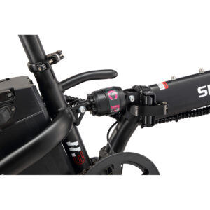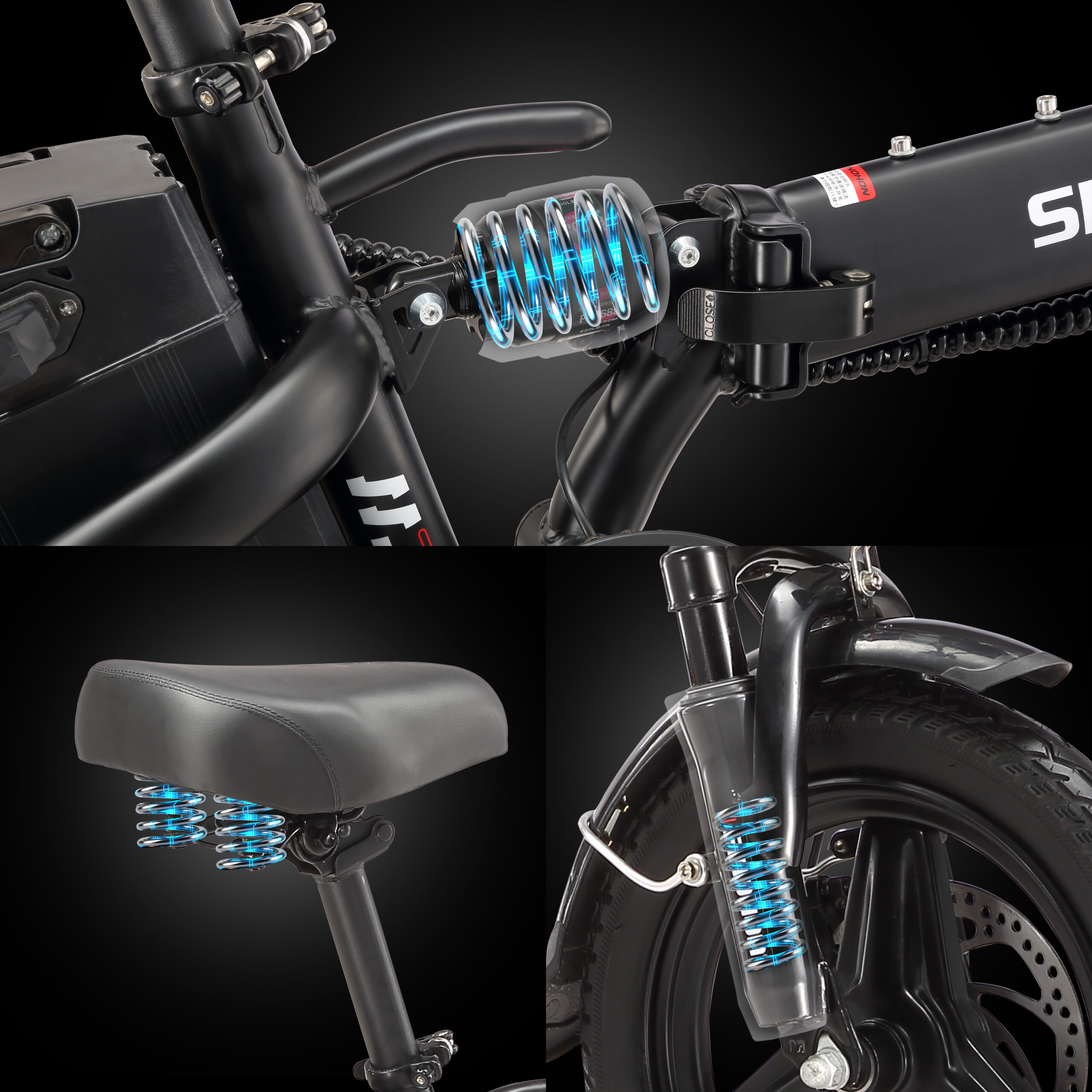 The M3 is equipped with a sophisticated 5-point suspension system that effectively absorbs road vibrations. This comprehensive system includes a front suspension fork, a dedicated shock-absorbing spring at the frame’s folding mechanism, a high-resilience steel main frame, a super-sized thick comfort saddle, and a pair of high-elasticity shock-absorbing tires. Working in harmony, these five components dampen impacts from multiple directions, delivering an exceptionally smooth and comfortable ride.